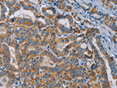 The image is immunohistochemistry of paraffin-embedded Human thyroid cancer tissue using CSB-PA133615(TAB3 Antibody) at dilution 1/25. (Original magnification: ×200)