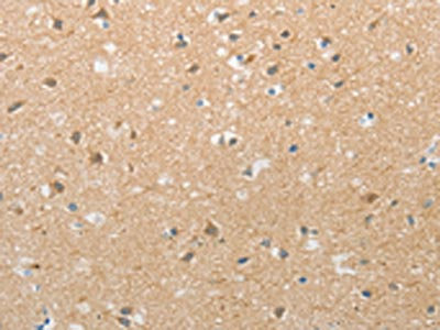 The image on the left is immunohistochemistry of paraffin-embedded Human brain tissue using CSB-PA125699(TACR2 Antibody) at dilution 1/20, on the right is treated with synthetic peptide. (Original magnification: ×200)