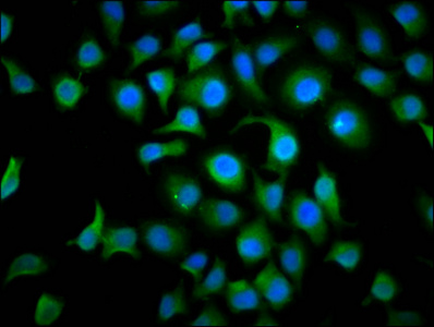Immunofluorescence staining of A549 cells with CSB-PA849782LA01HU at 1:166, counter-stained with DAPI. The cells were fixed in 4% formaldehyde, permeabilized using 0.2% Triton X-100 and blocked in 10% normal Goat Serum. The cells were then incubated with the antibody overnight at 4°C. The secondary antibody was Alexa Fluor 488-congugated AffiniPure Goat Anti-Rabbit IgG(H+L).