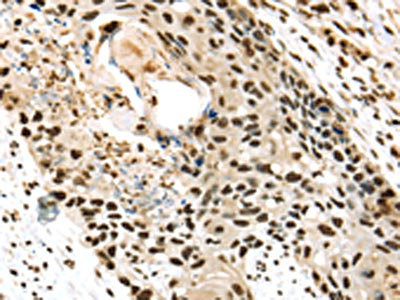 The image on the left is immunohistochemistry of paraffin-embedded Human esophagus cancer tissue using CSB-PA977634(TALDO1 Antibody) at dilution 1/30, on the right is treated with fusion protein. (Original magnification: ×200)