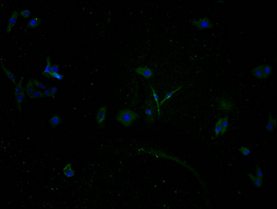 Immunofluorescence staining of HepG2 cells with CSB-PA885769PA01HU at 1:100, counter-stained with DAPI. The cells were fixed in 4% formaldehyde and blocked in 10% normal Goat Serum. The cells were then incubated with the antibody overnight at 4°C. The secondary antibody was Alexa Fluor 488-congugated AffiniPure Goat Anti-Rabbit IgG(H+L).