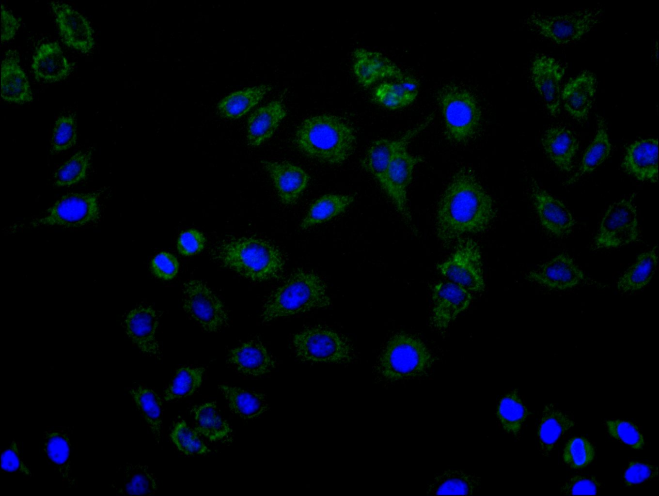 Immunofluorescence staining of Hela cell with CSB-PA823452LA01HU at 1:100, counter-stained with DAPI. The cells were fixed in 4% formaldehyde and and permeated by 0.2% TritonX-100 for 15 min. Then 10% normal goat serum to block non-specific protein-protein interactions . The cells were then incubated with the antibody overnight at 4℃. The secondary antibody was Alexa Fluor 488-congugated AffiniPure Goat Anti-Rabbit IgG(H+L).