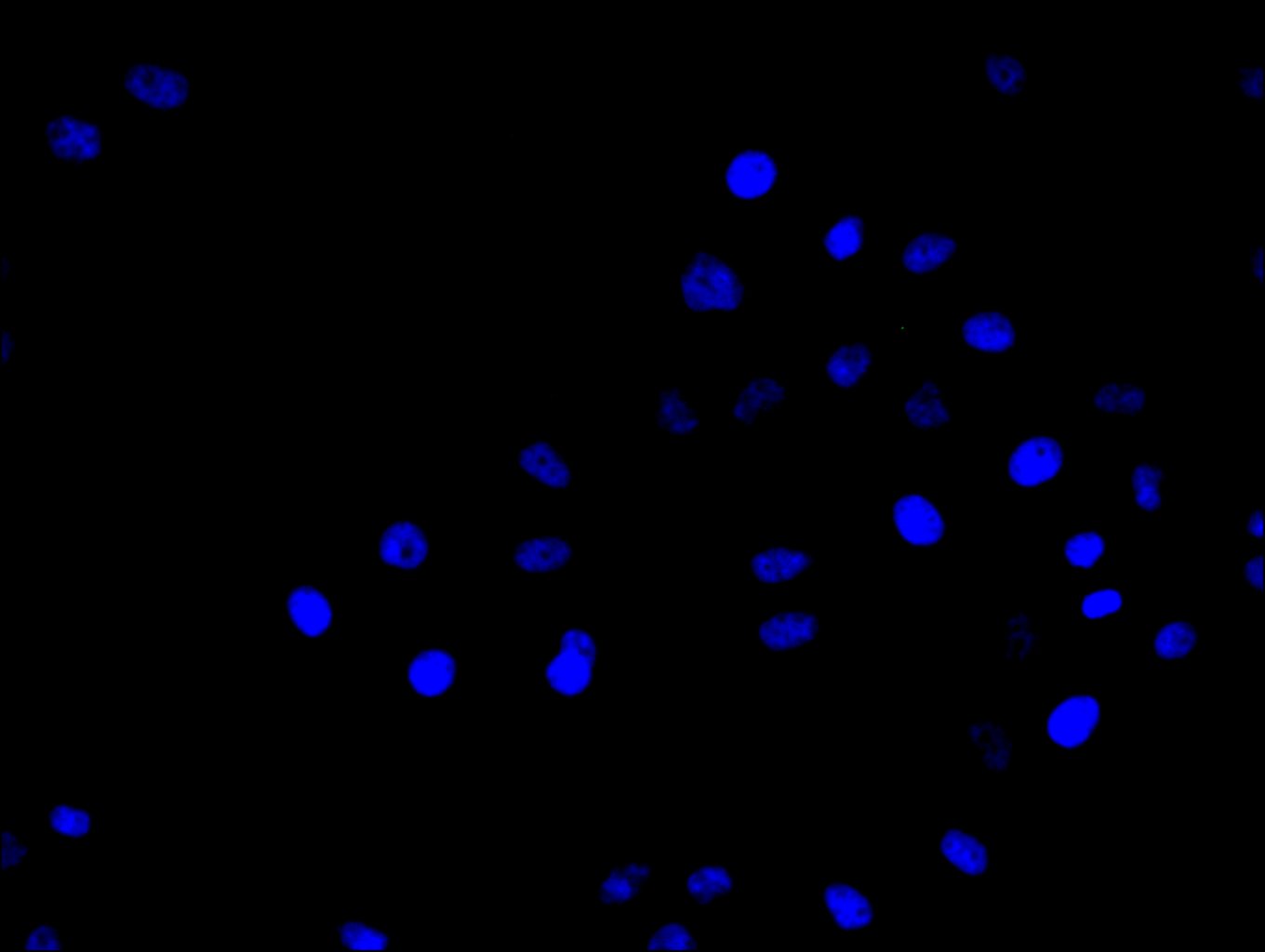 Immunofluorescence staining of Hela cell with 5% goat serum, counter-stained with DAPI. The cells were fixed in 4% formaldehyde and blocked in 10% normal Goat Serum. The cells were then incubated with the antibody overnight at 4C. The secondary antibody was Alexa Fluor 488-congugated AffiniPure Goat Anti-Rabbit IgG(H+L).