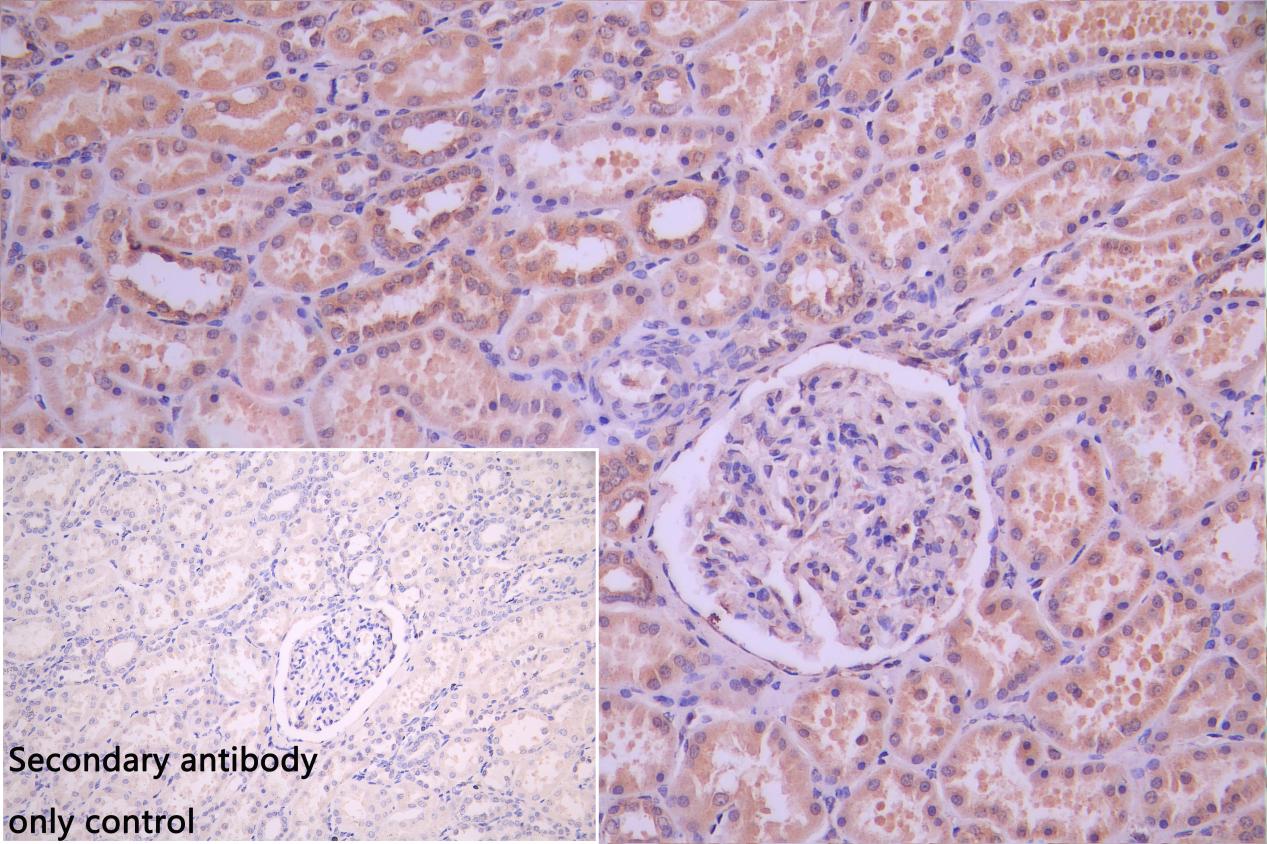 IHC image of CSB-PA823452LA01HU diluted at 1:50 and staining in paraffin-embedded human kidney tissue performed on a Leica BondTM system. After dewaxing and hydration, antigen retrieval was mediated by high pressure in a citrate buffer (pH 6.0). Section was blocked with 10% normal goat serum 30min at RT. Then primary antibody (1% BSA) was incubated at 4°C overnight. The primary is detected by a Goat anti-rabbit polymer IgG labeled by HRP and visualized using 0.05% DAB. Secondary antibody only control: uses 1% BSA instead of primary antibody