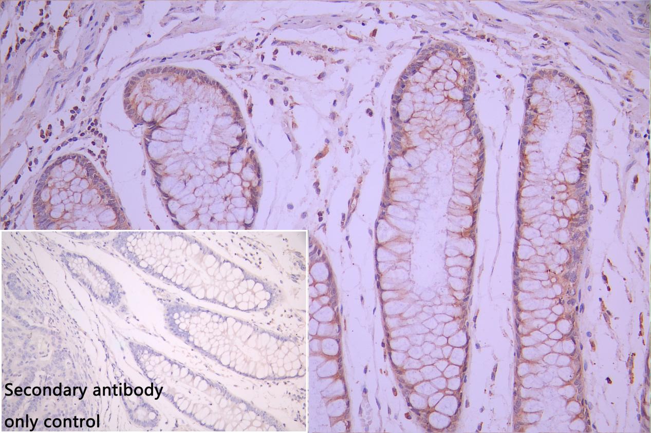 IHC image of CSB-PA823452LA01HU diluted at 1:50 and staining in paraffin-embedded humancolorectal cancer performed on a Leica BondTM system. After dewaxing and hydration, antigen retrieval was mediated by high pressure in a citrate buffer (pH 6.0). Section was blocked with 10% normal goat serum 30min at RT. Then primary antibody (1% BSA) was incubated at 4°C overnight. The primary is detected by a Goat anti-rabbit polymer IgG labeled by HRP and visualized using 0.05% DAB. Secondary antibody only control: uses 1% BSA instead of primary antibody