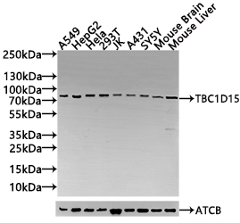 Positive WB detected in: A549 whole cell lysate(30μg), HepG2 whole cell lysate(30μg), Hela whole cell lysate(30μg), 293T whole cell lysate(30μg), JK whole cell lysate(30μg), A431 whole cell lysate(30μg), SY5Y whole cell lysate(30μg),Mouse Brain tissue lysate(30μg),Mouse Liver tissue lysate(30μg)