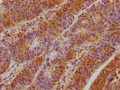 IHC image of CSB-PA662139LA01HU diluted at 1:400 and staining in paraffin-embedded human colon cancer performed on a Leica BondTM system. After dewaxing and hydration, antigen retrieval was mediated by high pressure in a citrate buffer (pH 6.0). Section was blocked with 10% normal goat serum 30min at RT. Then primary antibody (1% BSA) was incubated at 4°C overnight. The primary is detected by a biotinylated secondary antibody and visualized using an HRP conjugated SP system.