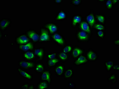 Immunofluorescence staining of Hela cells with CSB-PA008015LA01HU at 1:100, counter-stained with DAPI. The cells were fixed in 4% formaldehyde, permeabilized using 0.2% Triton X-100 and blocked in 10% normal Goat Serum. The cells were then incubated with the antibody overnight at 4°C. The secondary antibody was Alexa Fluor 488-congugated AffiniPure Goat Anti-Rabbit IgG(H+L).