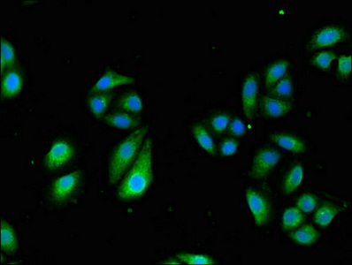 Immunofluorescent analysis of HepG2 cells using CSB-PA747352LA01HU at dilution of 1:100 and Alexa Fluor 488-congugated AffiniPure Goat Anti-Rabbit IgG(H+L)