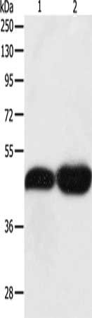 Gel: 10%SDS-PAGE, Lysate: 40 μg, Lane 1-2: NIH/3T3 cells, Lncap cells, Primary antibody: CSB-PA190435(TEKT1 Antibody) at dilution 1/500, Secondary antibody: Goat anti rabbit IgG at 1/8000 dilution, Exposure time: 10 minutes