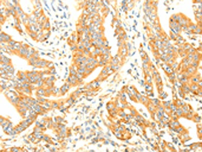 The image on the left is immunohistochemistry of paraffin-embedded Human gastric cancer tissue using CSB-PA996161(TERF1 Antibody) at dilution 1/20, on the right is treated with fusion protein. (Original magnification: ×200)