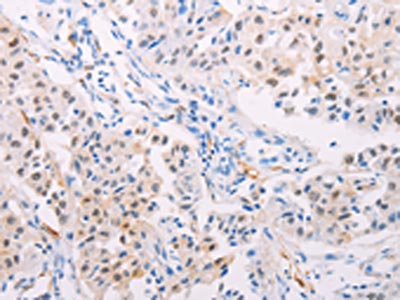 The image on the left is immunohistochemistry of paraffin-embedded Human lung cancer tissue using CSB-PA596121(TGM2 Antibody) at dilution 1/15, on the right is treated with fusion protein. (Original magnification: ×200)