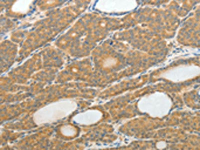 The image on the left is immunohistochemistry of paraffin-embedded Human thyroid cancer tissue using CSB-PA903853(TH Antibody) at dilution 1/10, on the right is treated with synthetic peptide. (Original magnification: ×200)