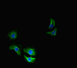 Immunofluorescent analysis of A549 cells using CSB-PA751092LA01HU at dilution of 1:100 and Alexa Fluor 488-congugated AffiniPure Goat Anti-Rabbit IgG(H+L)