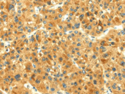 The image on the left is immunohistochemistry of paraffin-embedded Human liver cancer tissue using CSB-PA802027(THAP3 Antibody) at dilution 1/30, on the right is treated with synthetic peptide. (Original magnification: ×200)