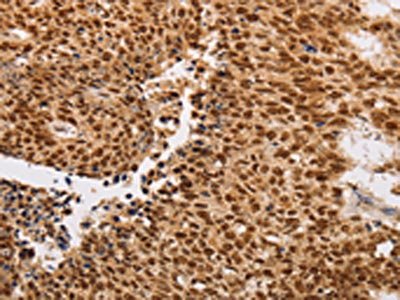The image on the left is immunohistochemistry of paraffin-embedded Human lung cancer tissue using CSB-PA154285(THOC7 Antibody) at dilution 1/30, on the right is treated with fusion protein. (Original magnification: ×200)