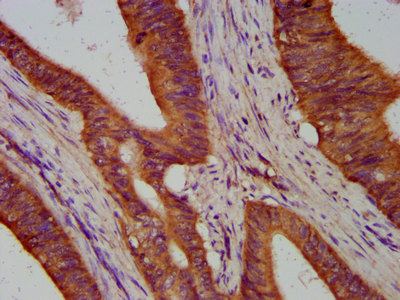 IHC image of CSB-PA892360LA01HU diluted at 1:300 and staining in paraffin-embedded human colon cancer performed on a Leica BondTM system. After dewaxing and hydration, antigen retrieval was mediated by high pressure in a citrate buffer (pH 6.0). Section was blocked with 10% normal goat serum 30min at RT. Then primary antibody (1% BSA) was incubated at 4°C overnight. The primary is detected by a biotinylated secondary antibody and visualized using an HRP conjugated SP system.