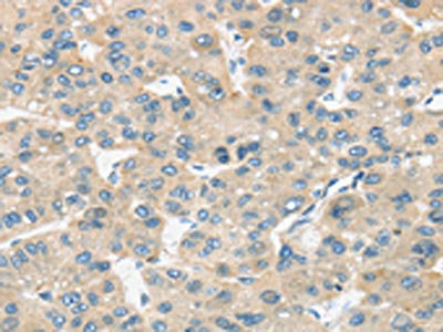 The image on the left is immunohistochemistry of paraffin-embedded Human liver cancer tissue using CSB-PA718808(TIRAP Antibody) at dilution 1/30, on the right is treated with fusion protein. (Original magnification: ×200)