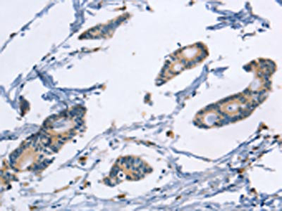 The image on the left is immunohistochemistry of paraffin-embedded Human colon cancer tissue using CSB-PA268874(TLR8 Antibody) at dilution 1/40, on the right is treated with fusion protein. (Original magnification: ×200)