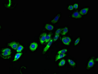Immunofluorescent analysis of HepG2 cells using CSB-PA023615LA01HU at dilution of 1:100 and Alexa Fluor 488-congugated AffiniPure Goat Anti-Rabbit IgG(H+L)