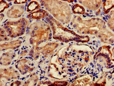 IHC image of CSB-PA891784LA01HU diluted at 1:500 and staining in paraffin-embedded human kidney tissue performed on a Leica BondTM system. After dewaxing and hydration, antigen retrieval was mediated by high pressure in a citrate buffer (pH 6.0). Section was blocked with 10% normal goat serum 30min at RT. Then primary antibody (1% BSA) was incubated at 4°C overnight. The primary is detected by a biotinylated secondary antibody and visualized using an HRP conjugated SP system.