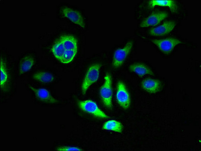 Immunofluorescent analysis of A549 cells using CSB-PA023713LA01HU at dilution of 1:100 and Alexa Fluor 488-congugated AffiniPure Goat Anti-Rabbit IgG(H+L)