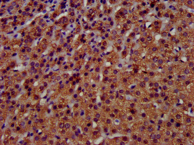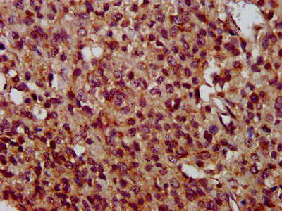 IHC image of CSB-PA023784LA01HU diluted at 1:400 and staining in paraffin-embedded human glioma performed on a Leica BondTM system. After dewaxing and hydration, antigen retrieval was mediated by high pressure in a citrate buffer (pH 6.0). Section was blocked with 10% normal goat serum 30min at RT. Then primary antibody (1% BSA) was incubated at 4°C overnight. The primary is detected by a biotinylated secondary antibody and visualized using an HRP conjugated SP system.