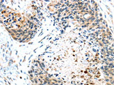The image on the left is immunohistochemistry of paraffin-embedded Human esophagus cancer tissue using CSB-PA034529(TMPRSS4 Antibody) at dilution 1/45, on the right is treated with fusion protein. (Original magnification: ×200)