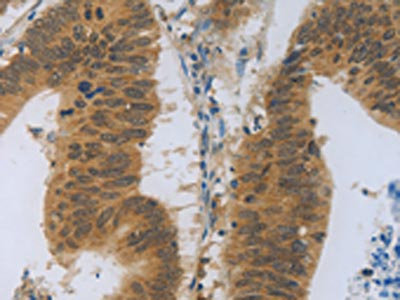 The image on the left is immunohistochemistry of paraffin-embedded Human colon cancer tissue using CSB-PA213664(TNFRSF11B Antibody) at dilution 1/30, on the right is treated with fusion protein. (Original magnification: ×200)