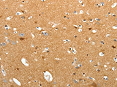 The image on the left is immunohistochemistry of paraffin-embedded Human brain tissue using CSB-PA073278(TNR Antibody) at dilution 1/60, on the right is treated with synthetic peptide. (Original magnification: ×200)