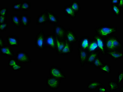 Immunofluorescence staining of Hela cells with CSB-PA839859LA01HU at 1:333, counter-stained with DAPI. The cells were fixed in 4% formaldehyde, permeabilized using 0.2% Triton X-100 and blocked in 10% normal Goat Serum. The cells were then incubated with the antibody overnight at 4°C. The secondary antibody was Alexa Fluor 488-congugated AffiniPure Goat Anti-Rabbit IgG(H+L).