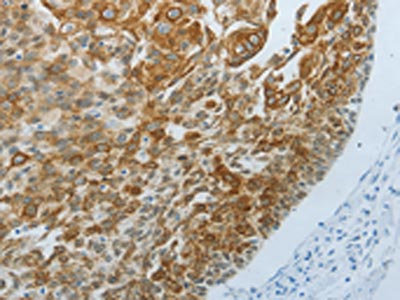 The image on the left is immunohistochemistry of paraffin-embedded Human cervical cancer tissue using CSB-PA900875(TP63 Antibody) at dilution 1/20, on the right is treated with fusion protein. (Original magnification: ×200)
