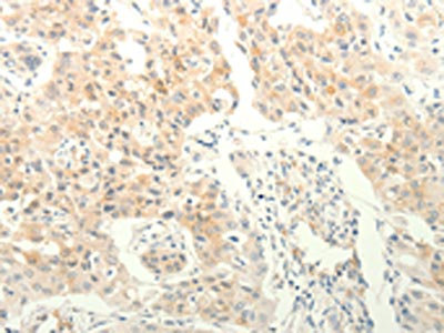 The image on the left is immunohistochemistry of paraffin-embedded Human lung cancer tissue using CSB-PA236814(TPH1 Antibody) at dilution 1/25, on the right is treated with fusion protein. (Original magnification: ×200)