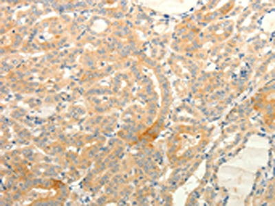 The image on the left is immunohistochemistry of paraffin-embedded Human thyroid cancer tissue using CSB-PA236814(TPH1 Antibody) at dilution 1/25, on the right is treated with fusion protein. (Original magnification: ×200)