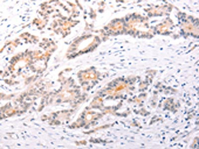 The image on the left is immunohistochemistry of paraffin-embedded Human colon cancer tissue using CSB-PA969451(TRAF3IP1 Antibody) at dilution 1/50, on the right is treated with fusion protein. (Original magnification: ×200)