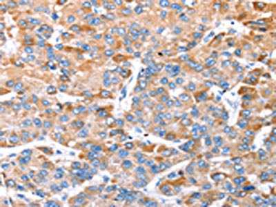 The image on the left is immunohistochemistry of paraffin-embedded Human liver cancer tissue using CSB-PA577609(TRIM14 Antibody) at dilution 1/35, on the right is treated with synthetic peptide. (Original magnification: ×200)