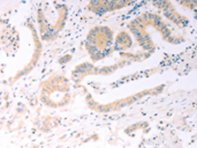 The image on the left is immunohistochemistry of paraffin-embedded Human colon cancer tissue using CSB-PA956978(TRIM32 Antibody) at dilution 1/25, on the right is treated with fusion protein. (Original magnification: ×200)