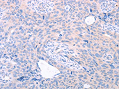 The image on the left is immunohistochemistry of paraffin-embedded Human cervical cancer tissue using CSB-PA956978(TRIM32 Antibody) at dilution 1/25, on the right is treated with fusion protein. (Original magnification: ×200)