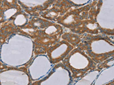 The image on the left is immunohistochemistry of paraffin-embedded Human thyroid cancer tissue using CSB-PA263066(TRIM40 Antibody) at dilution 1/40, on the right is treated with synthetic peptide. (Original magnification: ×200)