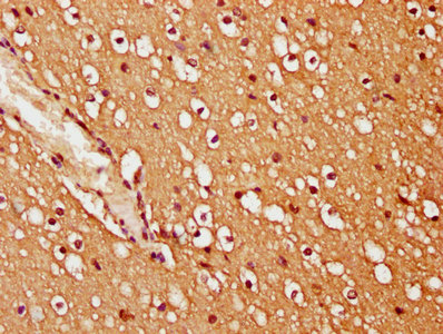 IHC image of CSB-PA862044LA01HU diluted at 1:200 and staining in paraffin-embedded human brain tissue performed on a Leica BondTM system. After dewaxing and hydration, antigen retrieval was mediated by high pressure in a citrate buffer (pH 6.0). Section was blocked with 10% normal goat serum 30min at RT. Then primary antibody (1% BSA) was incubated at 4°C overnight. The primary is detected by a biotinylated secondary antibody and visualized using an HRP conjugated SP system.