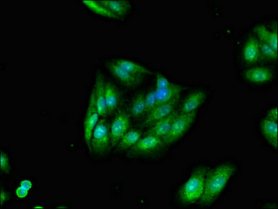 Immunofluorescent analysis of HepG2 cells using CSB-PA861180LA01HU at dilution of 1:100 and Alexa Fluor 488-congugated AffiniPure Goat Anti-Rabbit IgG(H+L)
