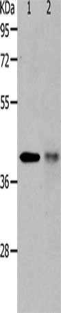 Gel: 10%SDS-PAGE, Lysate: 40 μg, Lane 1-2: NIH/3T3 cells, human fetal muscle tissue, Primary antibody: CSB-PA271046(TRIM63 Antibody) at dilution 1/1200, Secondary antibody: Goat anti rabbit IgG at 1/8000 dilution, Exposure time: 50 seconds