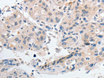 The image on the left is immunohistochemistry of paraffin-embedded Human liver cancer tissue using CSB-PA244928(TRPM1 Antibody) at dilution 1/30, on the right is treated with synthetic peptide. (Original magnification: ×200)