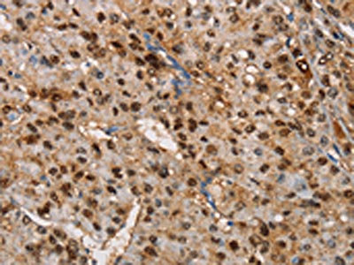 The image on the left is immunohistochemistry of paraffin-embedded Human liver cancer tissue using CSB-PA155145(TSPEAR Antibody) at dilution 1/50, on the right is treated with fusion protein. (Original magnification: ×200)