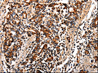The image on the left is immunohistochemistry of paraffin-embedded Human stomach cancer tissue using CSB-PA143118(TTR Antibody) at dilution 1/10, on the right is treated with fusion protein. (Original magnification: ×200)