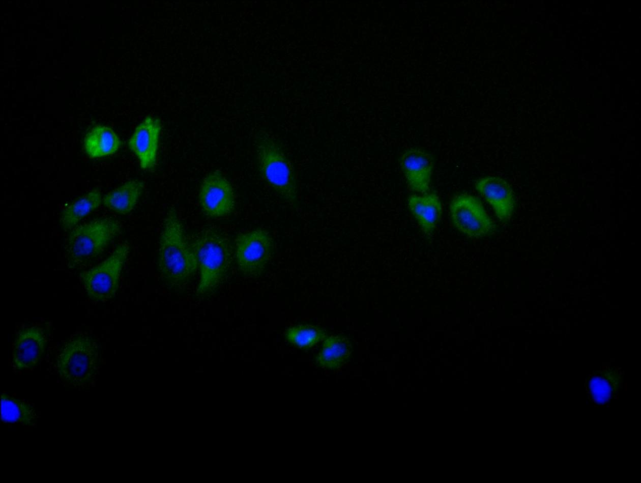 Immunofluorescence staining of Hela cell with CSB-PA867139LA01HU at 1:30, counter-stained with DAPI. The cells were fixed in 4% formaldehyde and blocked in 10% normal Goat Serum. The cells were then incubated with the antibody overnight at 4C. The secondary antibody was Alexa Fluor 488-congugated AffiniPure Goat Anti-Rabbit IgG(H+L).