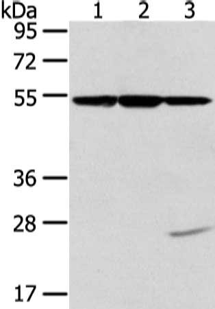 Gel: 8%SDS-PAGE, Lysate: 40 μg, Lane 1-3: Hela, K562 and NIH/3T3 cell, Primary antibody: CSB-PA067976(TUBA1C Antibody) at dilution 1/400 dilution, Secondary antibody: Goat anti rabbit IgG at 1/8000 dilution, Exposure time: 10 seconds