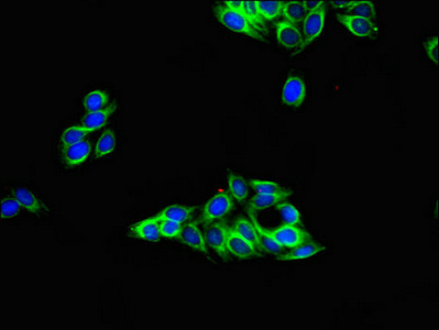 • Immunofluorescent analysis of HepG2 cells using CSB-PA09499A0Rb at dilution of 1:100 and Alexa Fluor 488-congugated AffiniPure Goat Anti-Rabbit IgG(H+L)