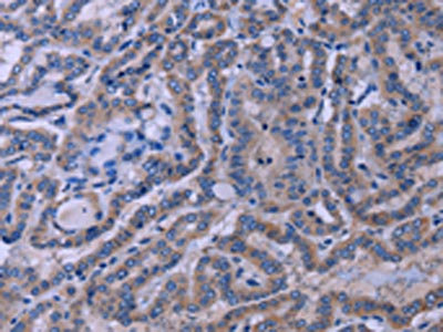 The image on the left is immunohistochemistry of paraffin-embedded Human thyroid cancer tissue using CSB-PA545808(TUBGCP2 Antibody) at dilution 1/50, on the right is treated with synthetic peptide. (Original magnification: ×200)