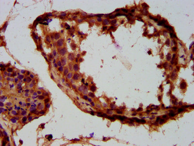 IHC image of CSB-PA025352LA01HU diluted at 1:300 and staining in paraffin-embedded human testis tissue performed on a Leica BondTM system. After dewaxing and hydration, antigen retrieval was mediated by high pressure in a citrate buffer (pH 6.0). Section was blocked with 10% normal goat serum 30min at RT. Then primary antibody (1% BSA) was incubated at 4°C overnight. The primary is detected by a biotinylated secondary antibody and visualized using an HRP conjugated SP system.